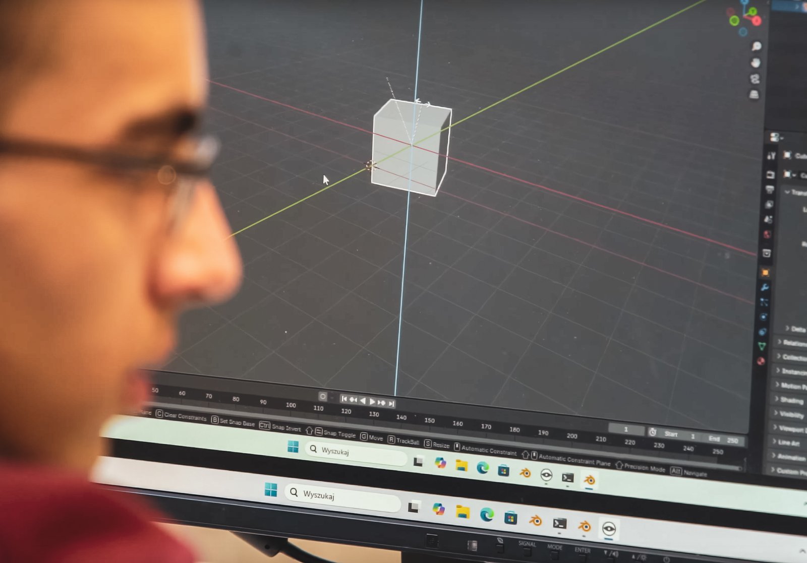 Uczestnicy poznają środowisko pracy w Blenderze – od poruszania się w przestrzeni 3D po obsługę narzędzi do budowania modeli.